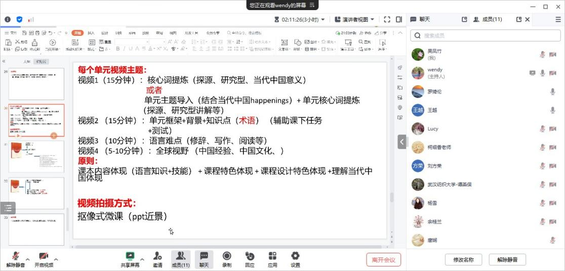 院长谭燕保教授首先回顾了过去一年51c吃瓜网每日大赛《理解当代中国》系列课程的开展与进展,让与会教师对“三进”工作、新文科建设、课程思政、在线课程等有了更深层次的了解,对后期的工作方向、课程建设目标有了更清晰的认识。基于老师们对《理解当代中国》系列课程的建设经验,尤其是《理解当代中国阅读与写作课程》的深刻认识与丰富教学体验,谭燕保教授谈了自己对本课程每一个主题的见解与上课思路,建议老师们可以透过教材文本从宏观到微观、从国家角度到全球角度去理解当代中国、历史中的中国、未来的中国。“作为教师,我们有了这种视野,这种思维和格局,立德树人、培养一流的外语人才、新时代的国际传播人才目标方可落到实处”,谭燕保教授对课程的后期建设提出了要求与希望。接着,课程团队教师结合自己过去一年的授课体验与经验,谈了后期在线课程建设的看法与建议。