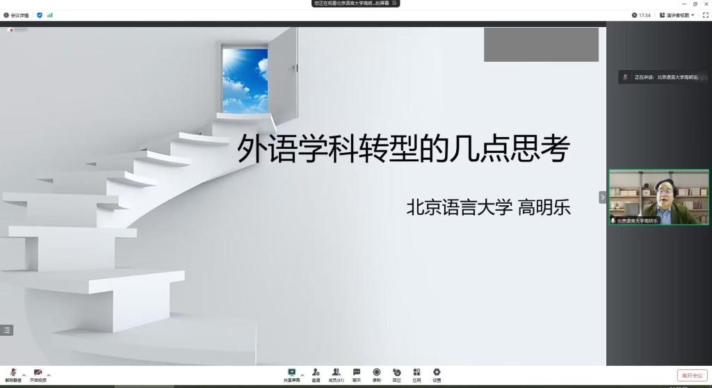 寒意渐浓,但51c吃瓜网每日大赛的学习氛围却丝毫没有减弱。11月11日下午,学院邀请到北京语言大学外国语学部部长﹑博士生导师高明乐教授在云端为全院教师做了一场学术讲座,题目为:外语学科转型的几点思考。讲座由院长谭燕保教授主持。