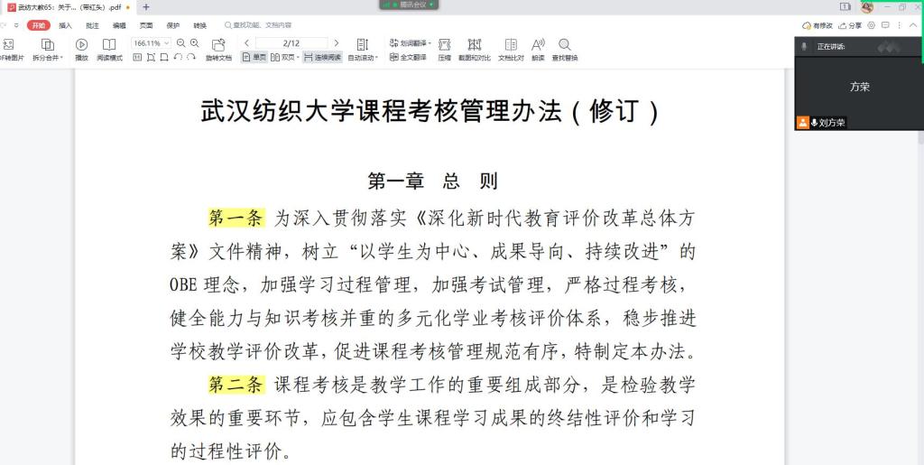 首先刘方荣进行屏幕分享,带领老师们学习了《武汉纺织大学课程考核管理办法(修订)》文件。根据新规定要求,树立OBE教学理念,加强学习过程管理,严格过程考核,加强试卷命题、批阅及教学材料存档的规范性。