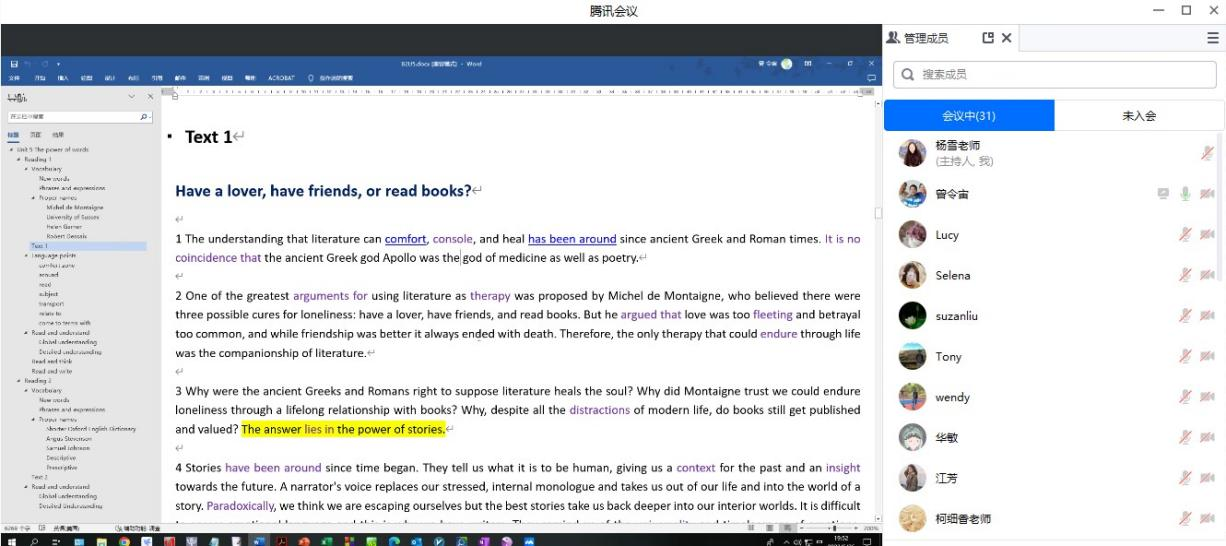 5月26日晚7点30分,大英一部全体教师在腾讯会议平台开展了线上教研活动。会议由杨雪主任主持,大英第一教研室的蔡倩老师和第二教研室的曾令宙老师进行了教学经验分享。