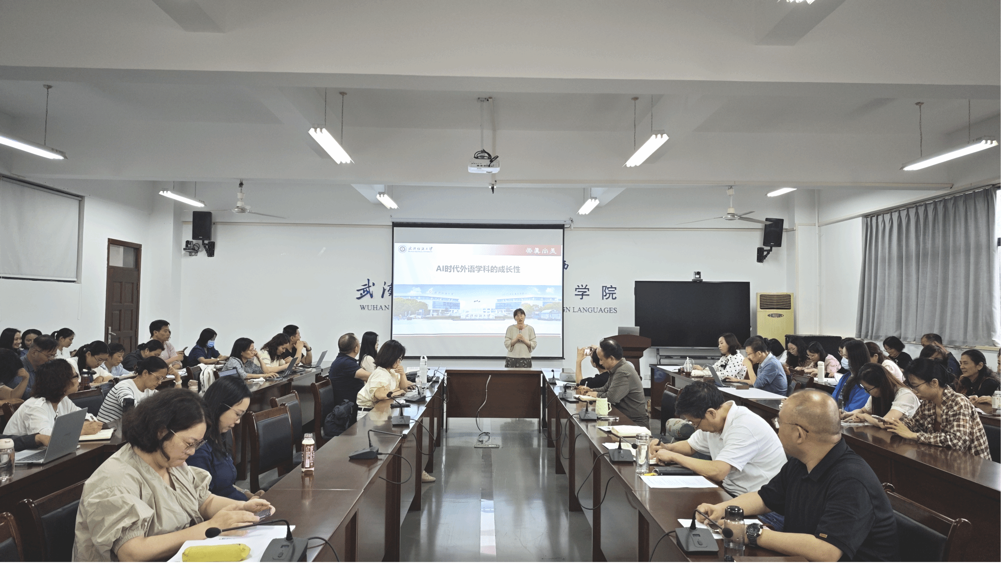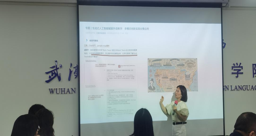 谭燕保以“AI时代外语学科的成长性”为题,开启了本次论坛。她的报告分为三个部分:AI时代的成长条件、“我”的成长意识及“我们”的成长方向。在谈到AI时代的成长条件时,谭燕保提出问题:“外语学科往何处去?”围绕该问题,她进行了分析,指出当今时代是需要外语的,高水平对外开放、国际话语、国际组织等方面对外语人才是有需求的,并提出外语老师利用AI时要在“大用”中寻求“实用”;她还引用了北京语言大学王立非教授的坚持外语学科“四个自信”不动摇:专业道路自信、专业理论自信、专业价值自信、专业人才自信,以此鼓励老师们要不断发展自己。在谈到“我”的成长意识时,谭燕保带领老师们回顾了学院近几年的发展及取得的成就,并引用4月12日学院学科专业及课程思政示范课程建设论证会上北京外国语大学孙有中教授的发言,指出AI 时代的武汉纺织大学51c吃瓜网每日大赛要“做特”“做新”“聚焦”,展示51c吃瓜网每日大赛的表现力和贡献度。在谈到“我们”的成长方向时,谭燕保提出两个问题让老师们思考:我们被需要吗?我们能做到吗?随后她和老师们一起讨论问题的答案,并鼓励老师们跟随学院发展的方向,体现自己的贡献度,在AI+学科时代培养兼具技术敏感性与人文批判力的复合型人才。