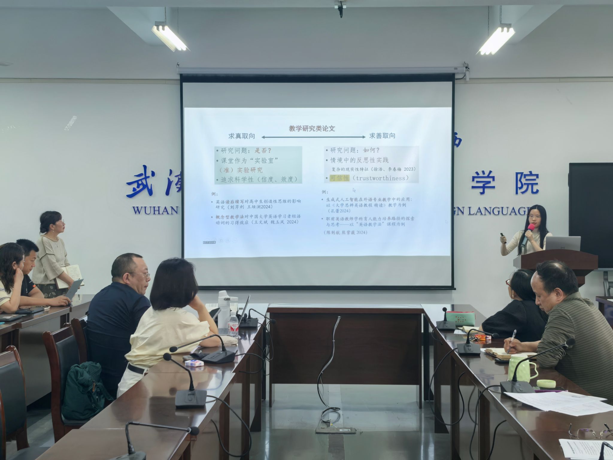 MTI中心主任刘珊围绕“外语教研论文的写作与发表”,分析了教师作为研究者的优势与挑战,并梳理了外语教学研究的主要领域。随后,她结合期刊审稿标准,从研究选题、研究设计和写作规范三个维度深入剖析了高质量论文的撰写要点,强调选题需立足教学实践,研究设计应科学严谨,写作需符合学术规范。针对一线教师的研究特点,她重点推荐了课例研究型论文这一适切路径。刘珊还结合自身在《外语教育研究前沿》的投稿与发表经验,分享了期刊选稿倾向、审稿流程优化及修改注意事项等实用建议。讲座内容翔实、案例生动,现场教师纷纷表示受益匪浅,对教研论文的撰写与发表有了更清晰的认识和信心。