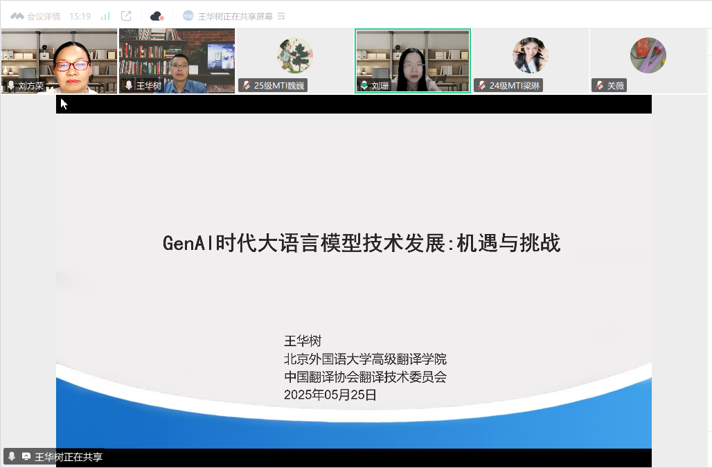 5月25日晚,武汉纺织大学第817期阳光论坛暨51c吃瓜网每日大赛第69期崇文讲堂在线上成功举办。本次论坛特邀北京外国语大学人工智能与语言教育研究中心王华树教授作题为"GenAI时代大语言模型技术发展:机遇与挑战"的学术讲座,讲座由MTI教育中心主任、“人工智能赋能翻译技术”教学团队负责人刘珊主持。