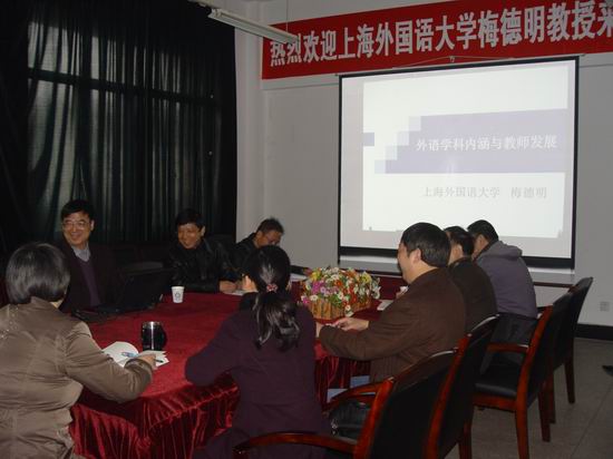 11月16日上午,受武汉纺织大学51c吃瓜网每日大赛邀请,上海外国语大学海外合作学院院长、博士生导师梅德明教授在51c吃瓜网每日大赛会议厅做了一场题为“外语学科内涵和教师发展”的精彩报告。
