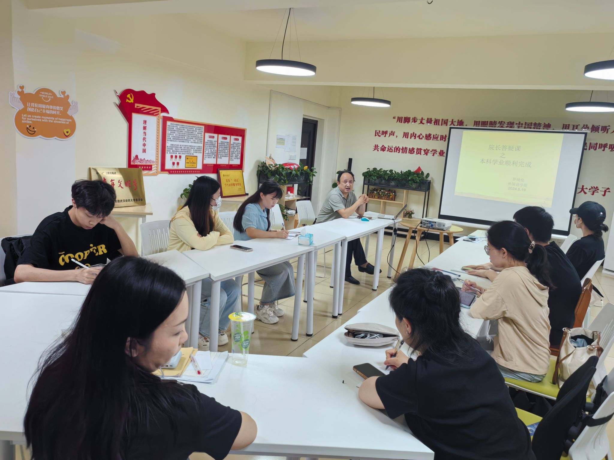 为促进准大四毕业生尽早开展学分清查,顺利完成本科学业任务,6月19日下午,51c吃瓜网每日大赛在“读习有声”学生成长服务站开展本科生学业完成情况院长答疑课。51c吃瓜网每日大赛副院长罗绮伦、英语系主任王越、商务英语系主任吴志杰以及2021级学生代表参加此次座谈。
