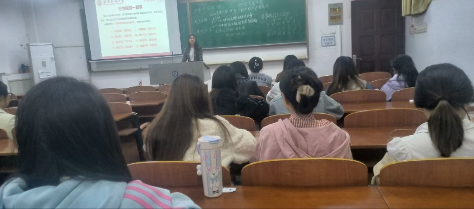 欲知平直,则必准绳;欲知方圆,则必规矩。班会伊始,老师带领学生一起学习教育部颁布的《高等学校学生行为准则》,包括志存高远,坚定信念;热爱祖国,服务人民;勤奋学习,自强不息;遵纪守法,弘扬正气等八个方面的内容。除此之外,班主任还列举了很多关于学校学籍学业管理、日常管理规定、奖助管理规定以及方方面面与同学们成长发展息息相关的政策和要求,提醒学生认真学习。