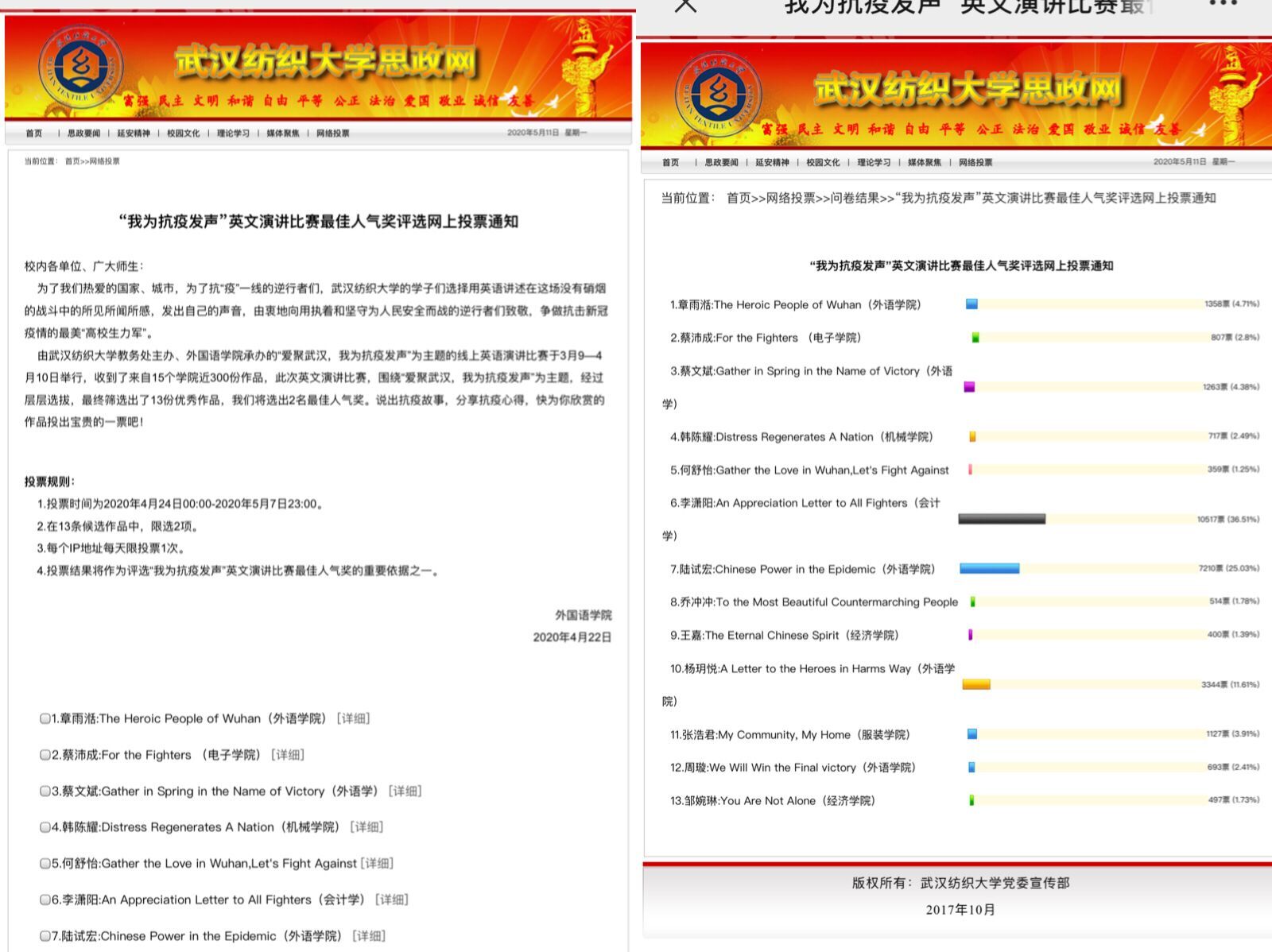 从作品中,能够深刻感受到同学们的真情实感,进一步弘扬了正能量, 增强了学生对战胜疫情的信心,有效引导了学生正确认识形势和科学对待疫情。经过激烈角逐,最终,外院章雨湉获得专业组一等奖,电气学院蔡沛成获得非专业组一等奖。 外院蔡文斌、乔冲冲获得专业组二等奖,机械学院韩陈耀、化工学院何舒怡、会计学院李潇阳获得非专业组二等奖。外院陆试宏、杨玥悦、周璇获得专业组三等奖,服装学院张浩君、经济学院王嘉、邹婉琳获得非专业组三等奖。