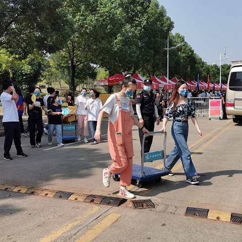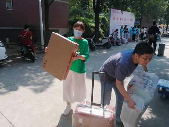图为学院志愿者老师帮助新生搬运行李