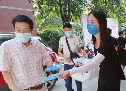 图为新生辅导员为学院志愿者老师分发定制口罩