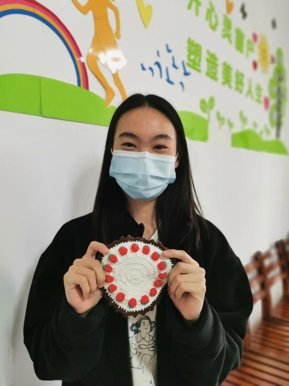 然后,邱凌云老师向大家展示自己的手工编织作品,有杯垫、手机包、抱枕、毛毯等,大家互相传看,纷纷表示赞叹,现场气氛十分活跃。邱凌云老师说:“其实手工编织非常有趣,大家可以在闲暇时光制作一些手工艺品,送给亲朋好友,不仅可以锻炼耐心,还能愉悦身心,拉近与身边人的距离。”接下来,邱凌云老师向大家介绍如何编织杯垫,大家兴致勃勃地学习。邱凌云老师对每一个同学耐心指导,大家都认真观看学习并反复练习。