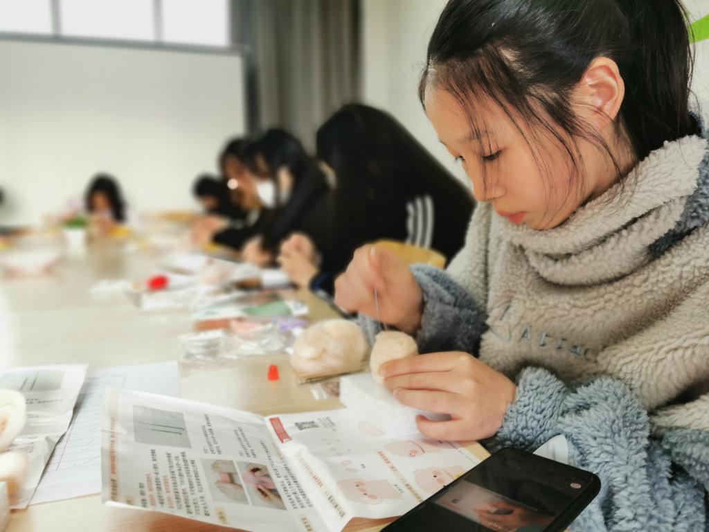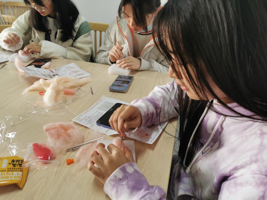 周曦老师还向大家展示了制作羊毛毡玩偶的基础操作,并分享了学习视频。她提倡,同学们可以先尝试制作简单的作品,等熟练操作以后可以开始自己创作,激发灵感,创造独一无二的作品。在动手过程中,同学们都开启了头脑风暴,各显身手,每个人都开始戳制自己心中那个最特别的玩偶。大部分学生是第一次自己动手操作,在周曦老师和其他有手工经验同学的指导和帮助下,他们也慢慢熟悉了基础的制作手法。活动结束时,同学们相互展示自己的作品,在谈笑声中学习他人经验、摸索手工乐趣。