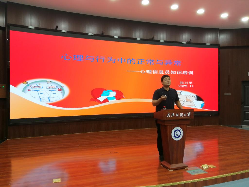 会上,张老师首先提到了心理健康的标准,从经验标准、统计学标准、社会规范标准和医学标准四个方面明确关注心理健康的重要性,强调了要关注心理问题形成的原因,并及时对出现心理问题的同学进行疏导,引导心理信息员注意关注身边的同学,并能进行基本的判断。其次,张老师为大家详细介绍了人类信息表达的构成及比例,突出了语气和体态在信息表达中的重要地位,他指出了解一个人要“听其言,观其行,关注成长环境和经历”。同时他还提到了世界卫生组织有关心理健康的八大标准,12类潜在心理危机的识别以及心理问题的时间与影响原则,呼吁大家密切关注同学们的精神状态和行为举止等情况,如有发现异常情况要第一时间报告辅导员,一起帮助同学化解心理困惑。最后张老师介绍了学校心理咨询中心开放时间及联系方式,鼓励同学们充分利用学校资源,寻求心理疏导的途径,创建属于自己的“晴朗天空”。