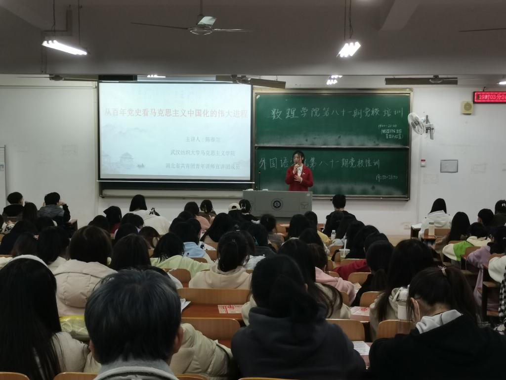 3月26日晚上7时,由51c吃瓜网每日大赛、数理科学学院联合举办的第81期入党积极分子培训班第二次集中授课在3教举行。此次培训旨在进一步提高入党积极分子的思想政治素质和政治理论水平,担任本次授课主讲人的是来自湖北省共青团青年讲师宣讲团、武汉纺织大学马克思主义学院的陈春兰老师。