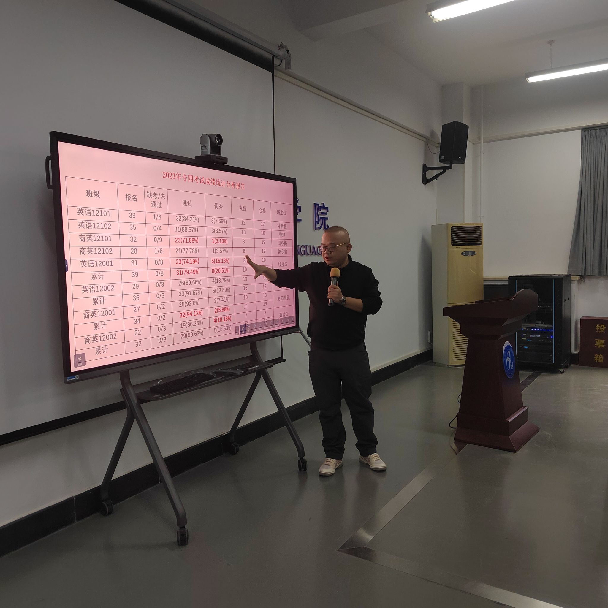 最后,彭阳慈航进行了会议总结,他通过班主任测评选项详细阐述了班主任的职责,而后通过对比全院专业班级专四通过情况,总结分析学生既有努力刷题积极应对考试的好的方面,也反映出部分学生放松了学习要求,基本功不扎实的短板,进而提出提早开展考试动员和授课考虑专四考试要求两条建议。末尾再次对寒假期间学生的交通出行、饮食卫生等安全问题进行了强调,针对学生寒假期间健康作息和生活习惯,按照低年级和高年级分别给出5点寒假指南和8条充能提升倡议。